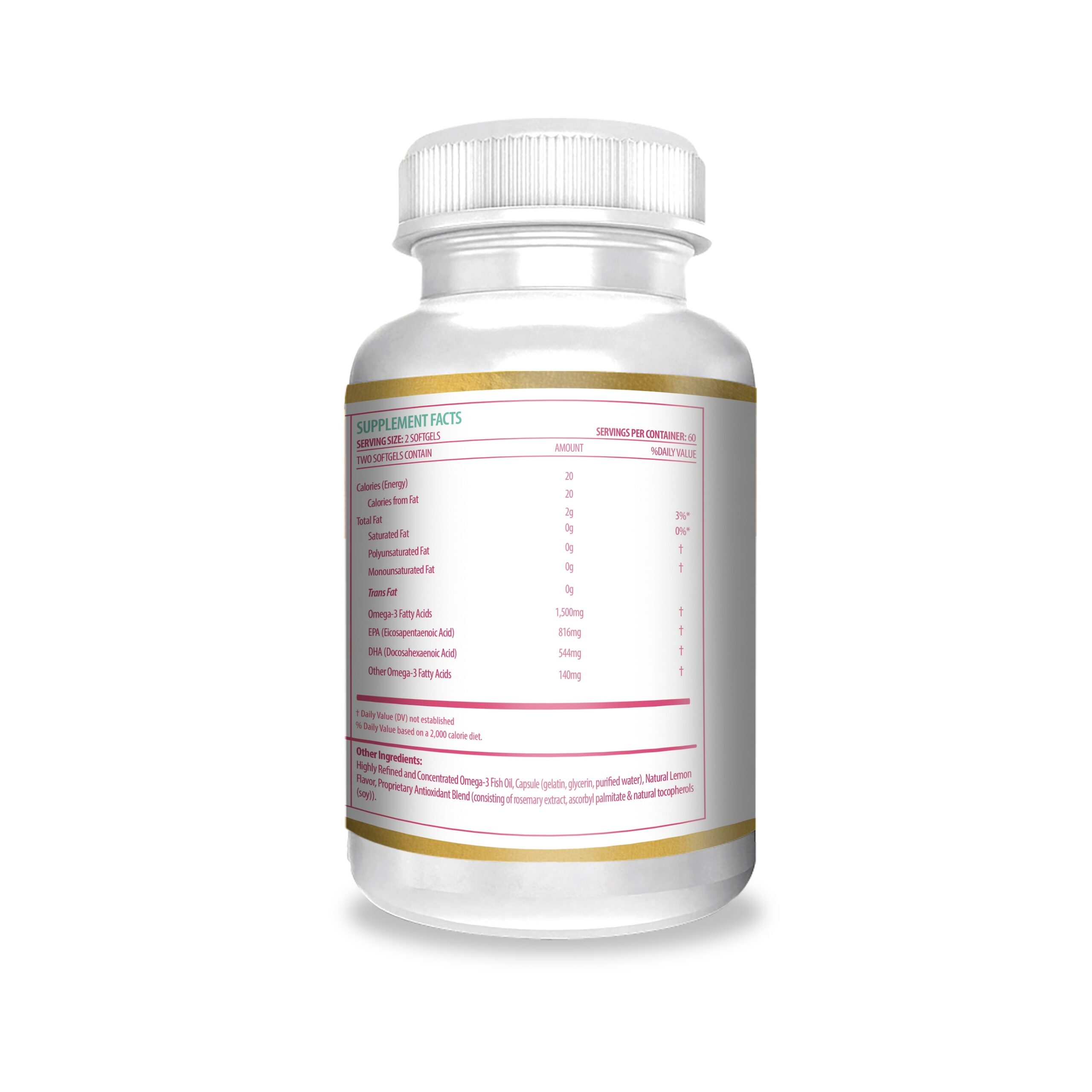 Ingredients: Alaskan Salmon Oil (1500mg Omega-3, 816mg EPA, 544mg DHA)